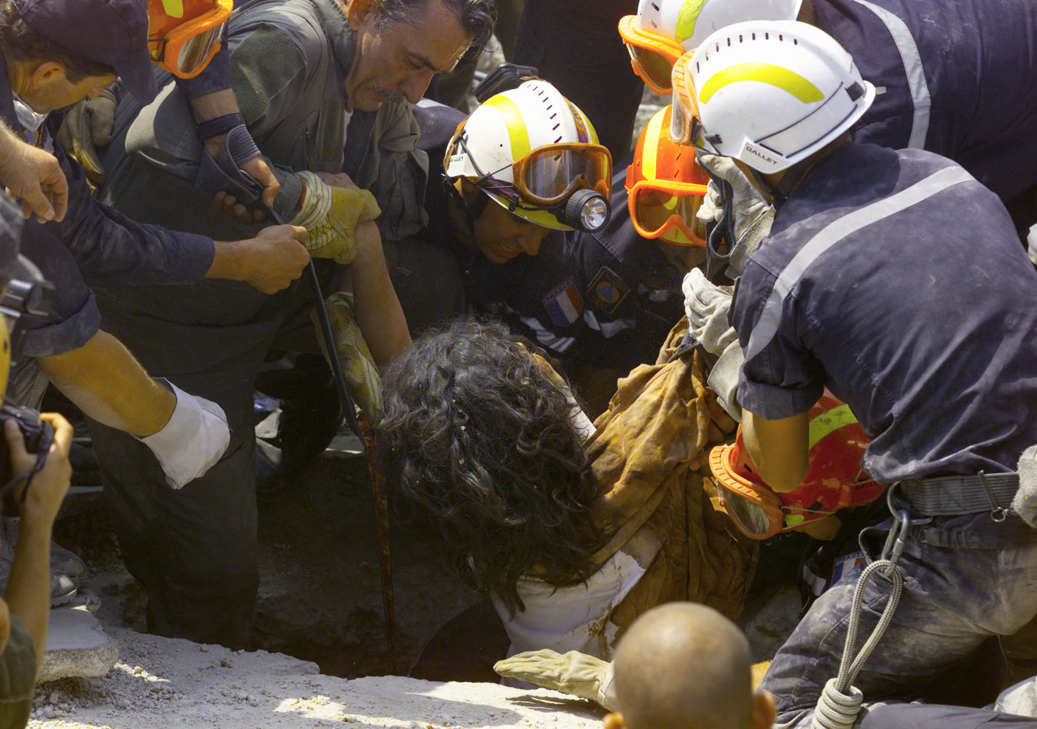 French rescue workers pull out Evi Vassilopoulos after she was buried for nearly 46 hours in the debris of Athens’ earthquake on September 9. The workers had struggled from the early hours to recover the young woman after sniffer dogs burying through the wreckage found her alive. yb/Photo by Yannis Behrakis REUTERS