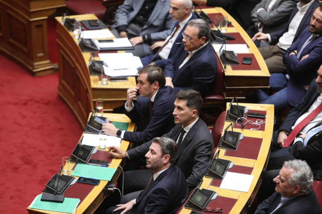 Ο πρόεδρος του ΠΑΣΟΚ ΚΙΝΑΛ Νίκος Ανδρουλάκης (Α) και ο πρόεδρος του ΣΥΡΙΖΑ ΠΣ Σωκράτης Φάμελλος (2Δ), παρακολουθούν ομιλίες κατά τη διάρκεια της δεύτερης μέρας της συζήτησης και ψήφισης επί της αρχής, των άρθρων και του συνόλου του σχεδίου νόμου του Υπουργείου Εργασίας και Κοινωνικής Ασφάλισης «Ενσωμάτωση της Οδηγίας (Ε.Ε.) 2022/2041 του Ευρωπαϊκού Κοινοβουλίου και του Συμβουλίου της 19ης Οκτωβρίου 2022 για επαρκείς κατώτατους μισθούς στην Ευρωπαϊκή Ένωση – Αναπροσαρμογή μισθών προσωπικού δημοσίου τομέα – Ρυθμίσεις για τον καθορισμό κατώτατου μισθού για τα έτη 2025, 2026 και 2027», Πέμπτη 5 Δεκεμβρίου 2024. ΑΠΕ-ΜΠΕ/ΑΠΕ-ΜΠΕ/ΓΙΩΡΓΟΣ ΒΙΤΣΑΡΑΣ