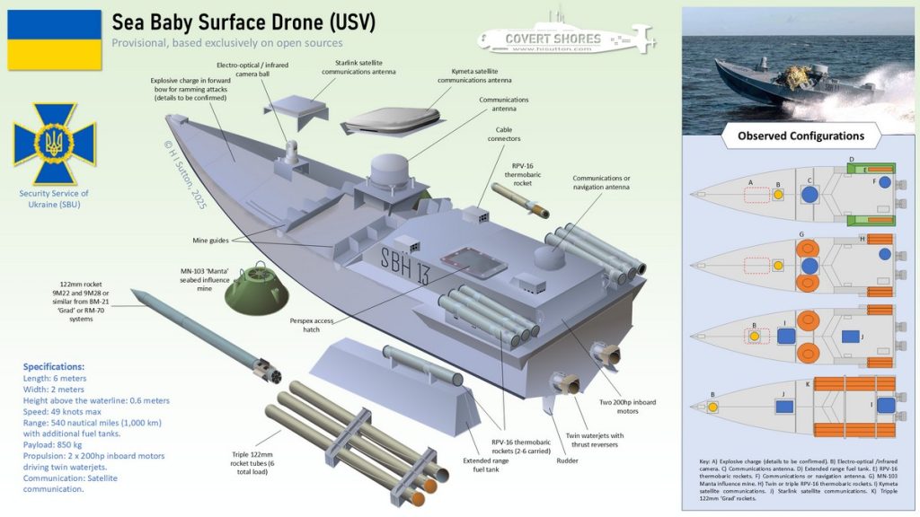 Beyond their main explosive payloads, Sea Babies can be equipped with thermobaric rockets, naval mines, or artillery rockets depending on mission needs. They have been observed operating with various weapons configurations, from short-range rockets used to suppress defenses to Italian-made Manta sea mines, which can target vessels at depths of 2.5 to 100 meters. Ukrainian drones equipped with such mines have previously been linked to damaging Russian warships.