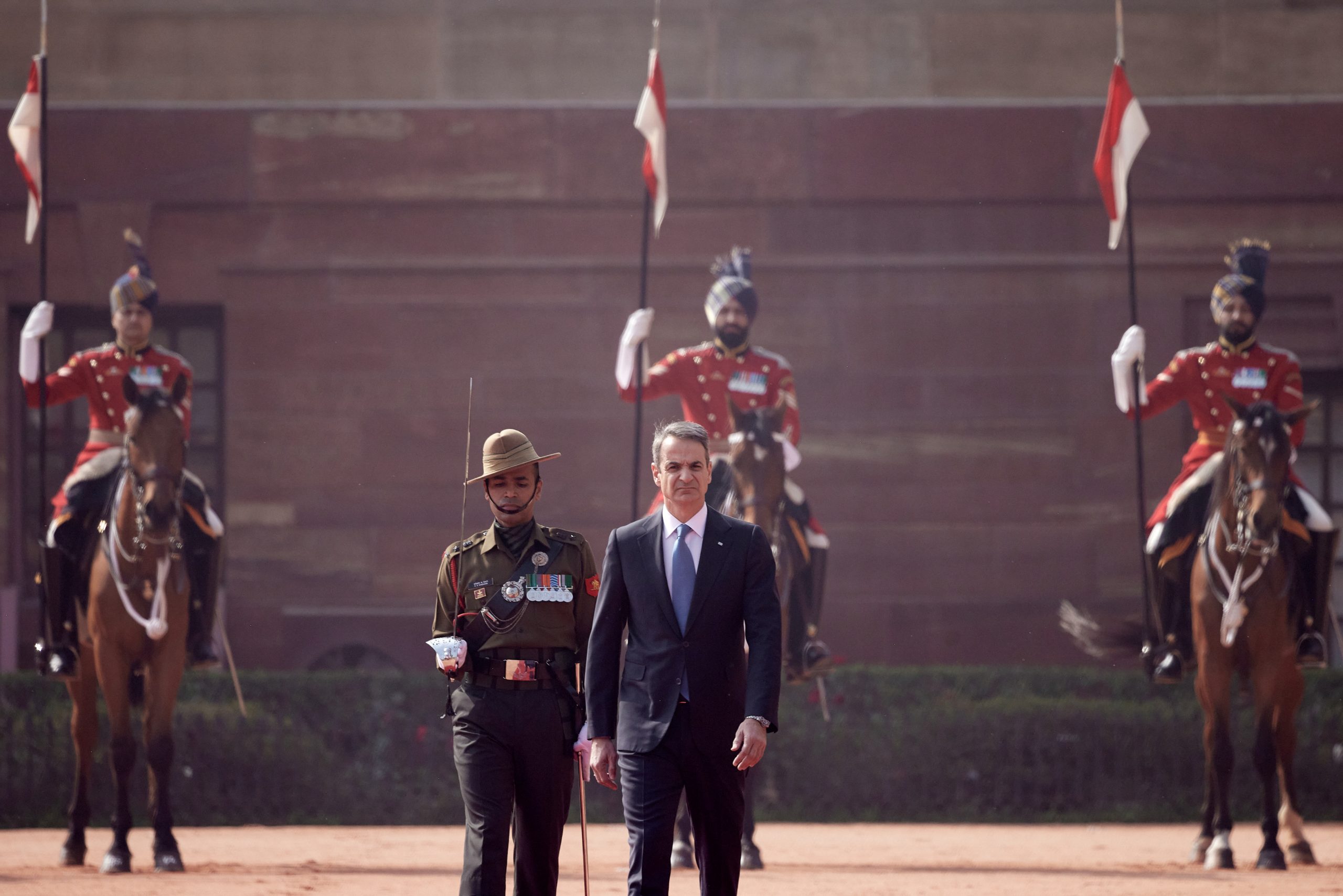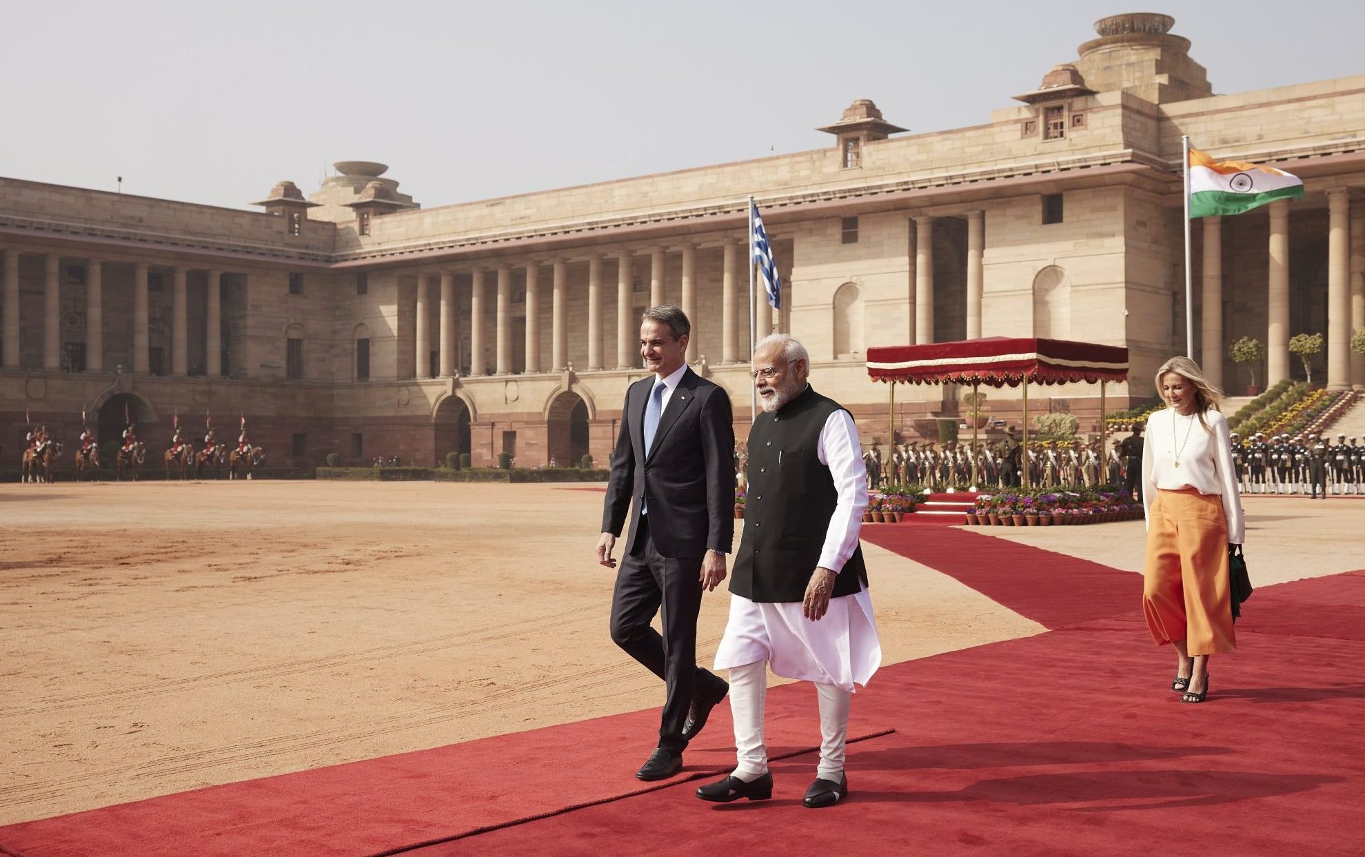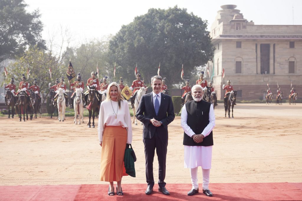 Prime Minister Kyriakos Mitsotakis, who is on an official visit to India , was officially welcomed by Prime Minister Narendra Modi at the Presidential Palace of India in New Delhi today.