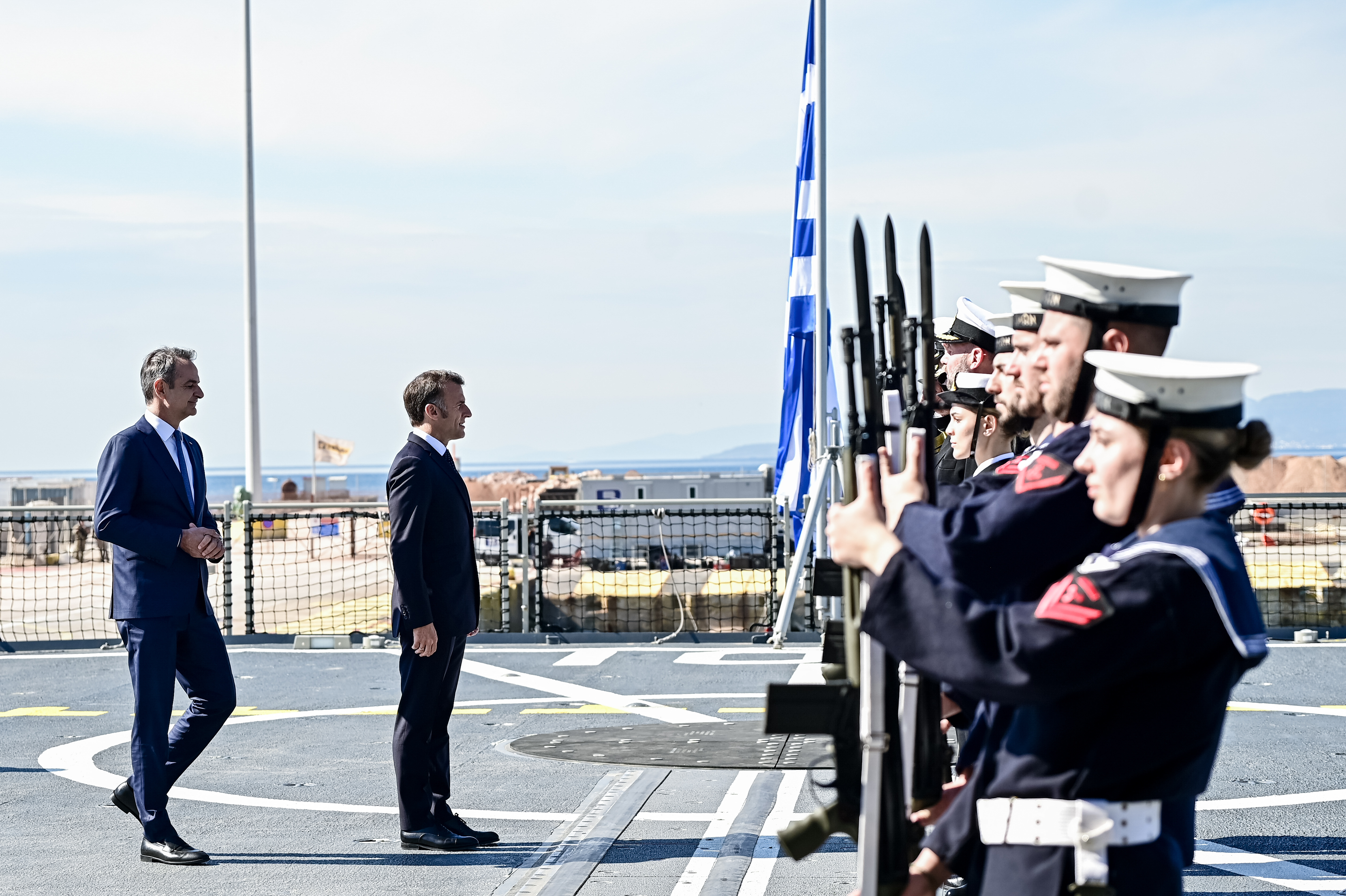 After the inspection, Mitsotakis and Macron disembarked shortly after 11 a.m., concluding the naval segment of the visit.