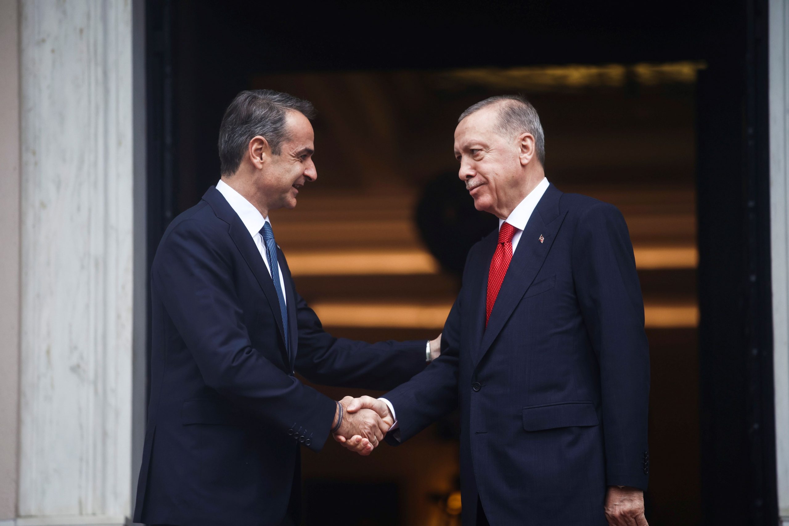 Greek Prime Minister Kyriakos Mitsotakis received Turkish President Recep Tayyip Erdogan at the Maximos Mansion in Athens on Thursday after the latter met Greek President Katerina Sakellaropoulou.