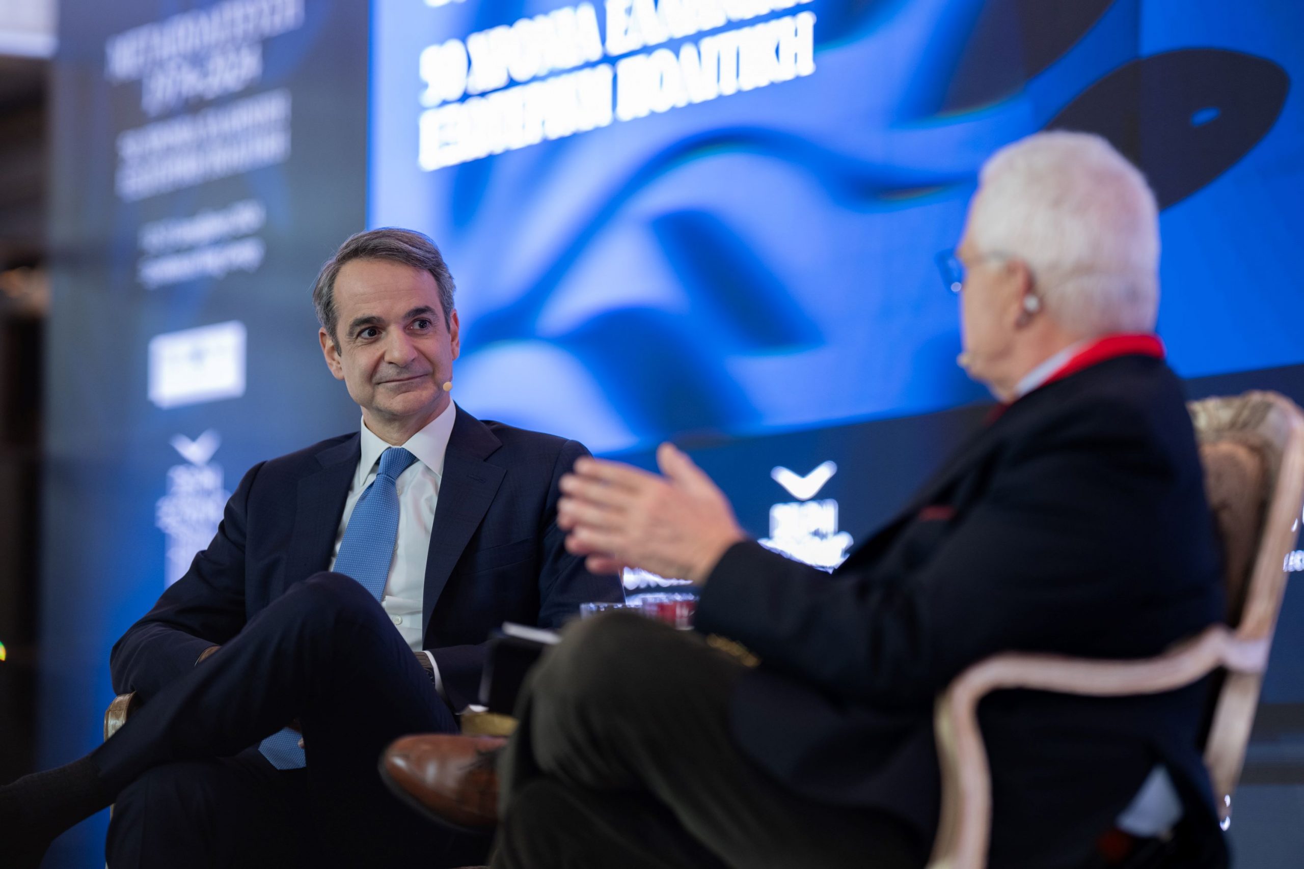 Mitsotakis spoke with Yannis Pretenteris, the publisher of To VIMA, to close out the two-day Conference “Metapolitefsi 1974-2024: 50 Years of Greek Foreign Policy”, organized by “To Vima”, The Council for International Relations and the Delphi Economic Forum.