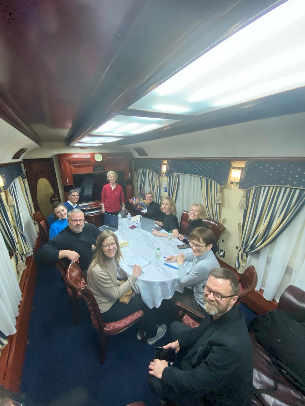 Night had already fallen when we departed, and we were soon called in for the customary briefing, led by the Commission President. Tireless and engaging, she preferred to speak to us standing up and was happy to answer all our questions, both journalistic and not, without evasions. As she spoke to us, naturally and free of officialese and any fear of journalists, it was clear that this was an experienced politician we had before us. Approachable and with a smile on her face, despite the packed schedule awaiting her in Ukraine. The journalists’ evening continued with chats in each others’ wagons-lits, until we fell asleep, waiting for the 11-hour journey to roll by and for the first images of Ukraine under black-out to appear.