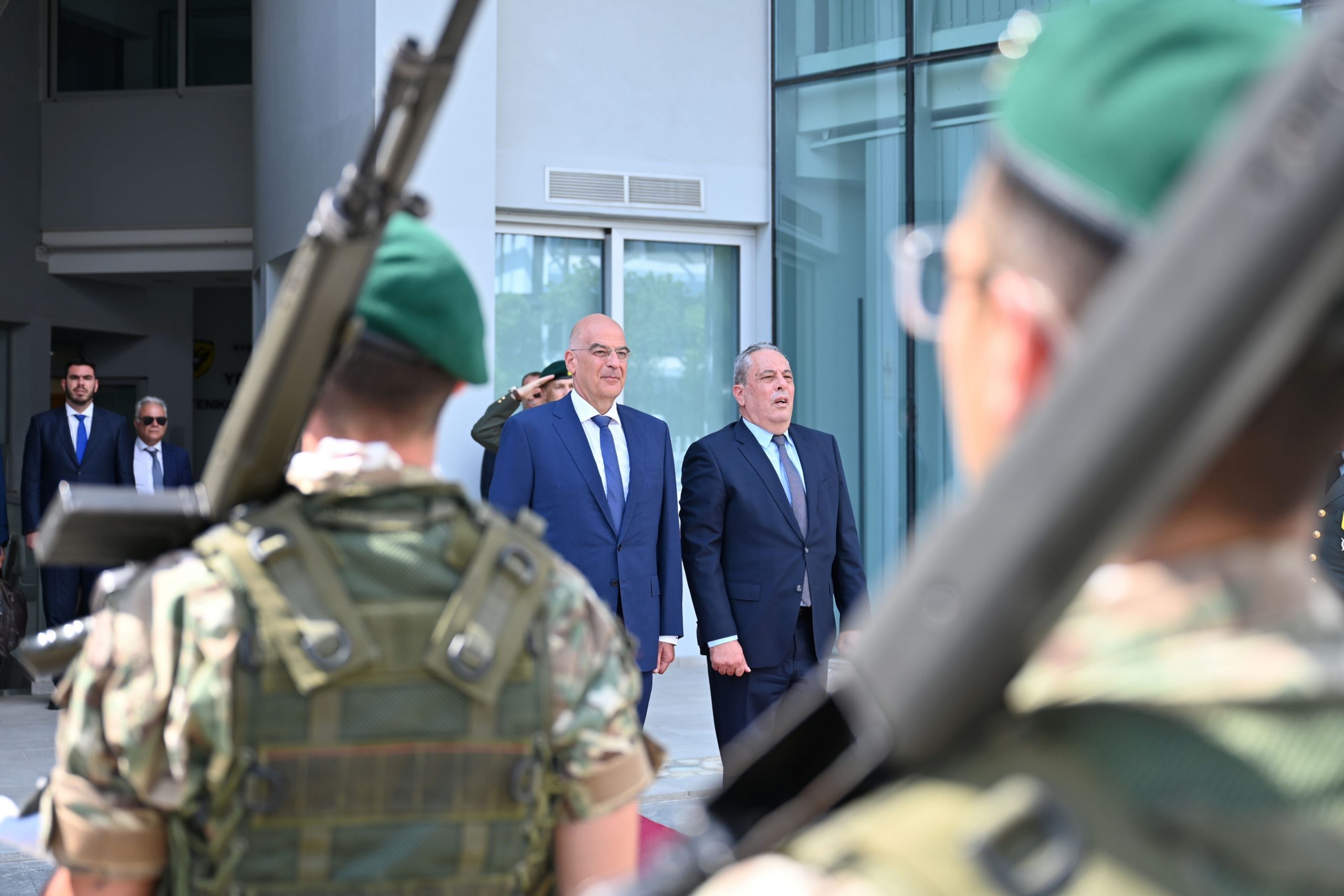 Ο Υπουργός Εθνικής Άμυνας Νίκος Δένδιας πραγματοποίησε σήμερα, επίσκεψη στην Κύπρο. Επισκέφθηκε το Υπουργείο Άμυνας της Κυπριακής Δημοκρατίας, όπου είχε συνάντηση με τον ομόλογό του, Βασίλη Πάλμα, την Δευτέρα 15 Ιουλίου 2024 (Γ.Τ ΥΠΟΥΡΓΕΙΟ ΑΜΥΝΑΣ/ EUROKINISSI)