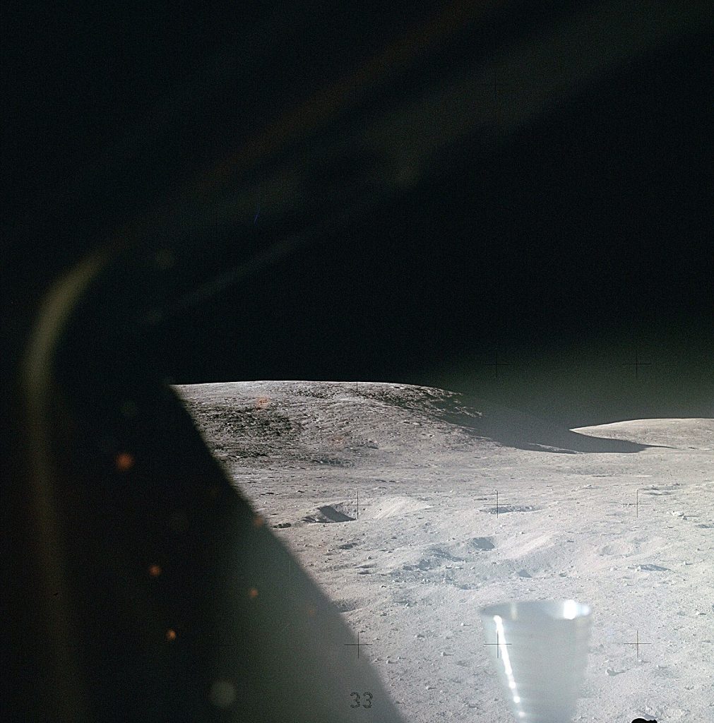 The view through the window of the Lunar Module Orion shortly after Apollo 16’s landing on the surface of the Moon. April 1972