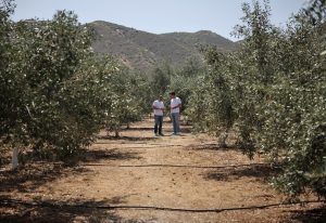 Olive oil producers Nick Schizas and Nicolas Netien stand at an olive grove in Evrychou, Cyprus June 10, 2025. REUTERS/Yiannis Kourtoglou