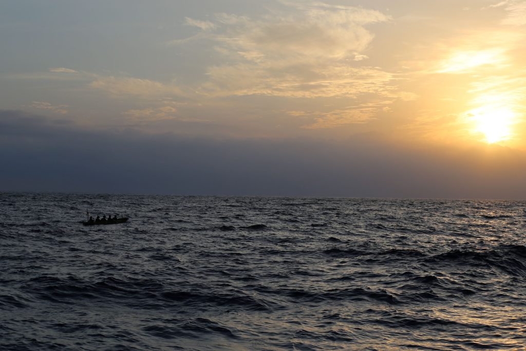 A dugout canoe with four men and one woman paddling is pictured during a crossing across a region of the East China Sea from near Ushibi, Taiwan to Yonaguni Island, traversing the Kuroshio current, in this handout image released on June 25, 2025. Yousuke Kaifu/Handout via REUTERS THIS IMAGE HAS BEEN SUPPLIED BY A THIRD PARTY. NO RESALES. NO ARCHIVES