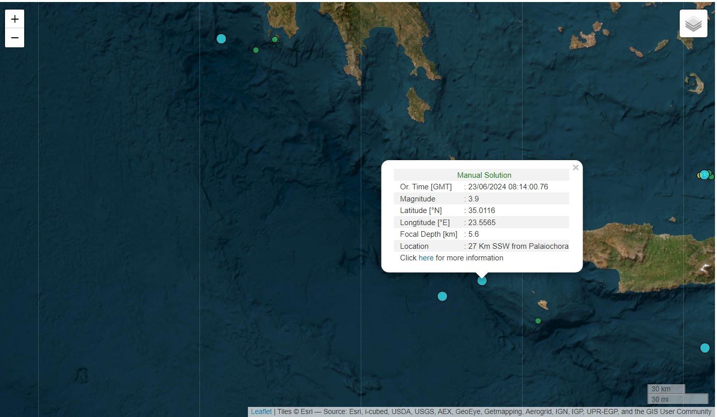 According to the Athens Observatory’s Geodynamics Institute, the tremor’s epicenter was located 24 kilometers southwest of the settlement of Palaiochora.