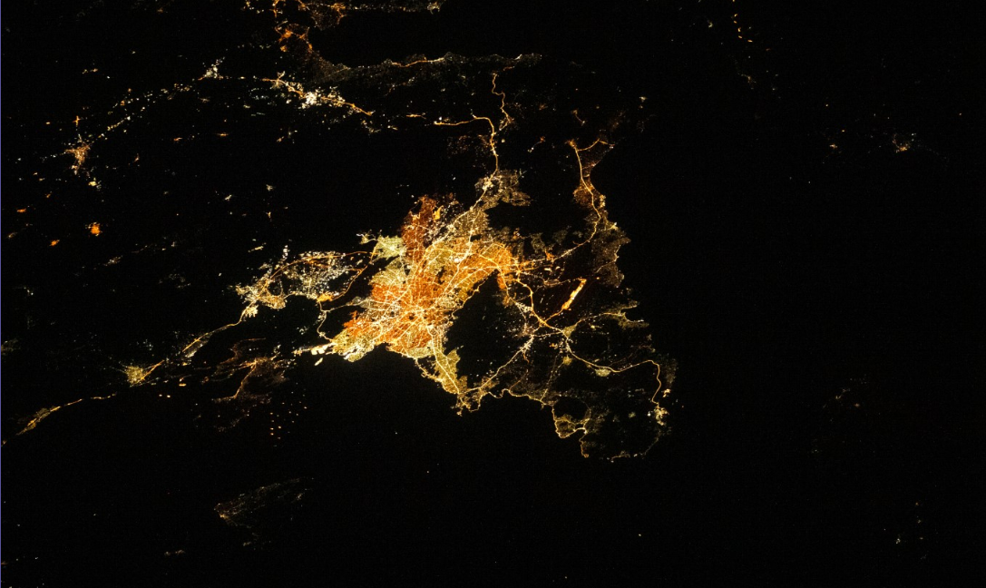 “In nighttime photos taken from above, sharp transitions from lit to unlit areas often occur where urban development meets a waterbody or rough, undeveloped terrain. In this photo, illumination cuts off sharply at the southern edge of Athens, where the city meets the Saronic Gulf. The city’s northwestern reaches also display a sharp drop in illumination due to the Párnitha mountains. Likewise, the lack of light between the city and Athens International Airport is due to the rugged terrain of the Hymettus mountains. The range is blanketed with forests that host archaeological sites and recreational areas.