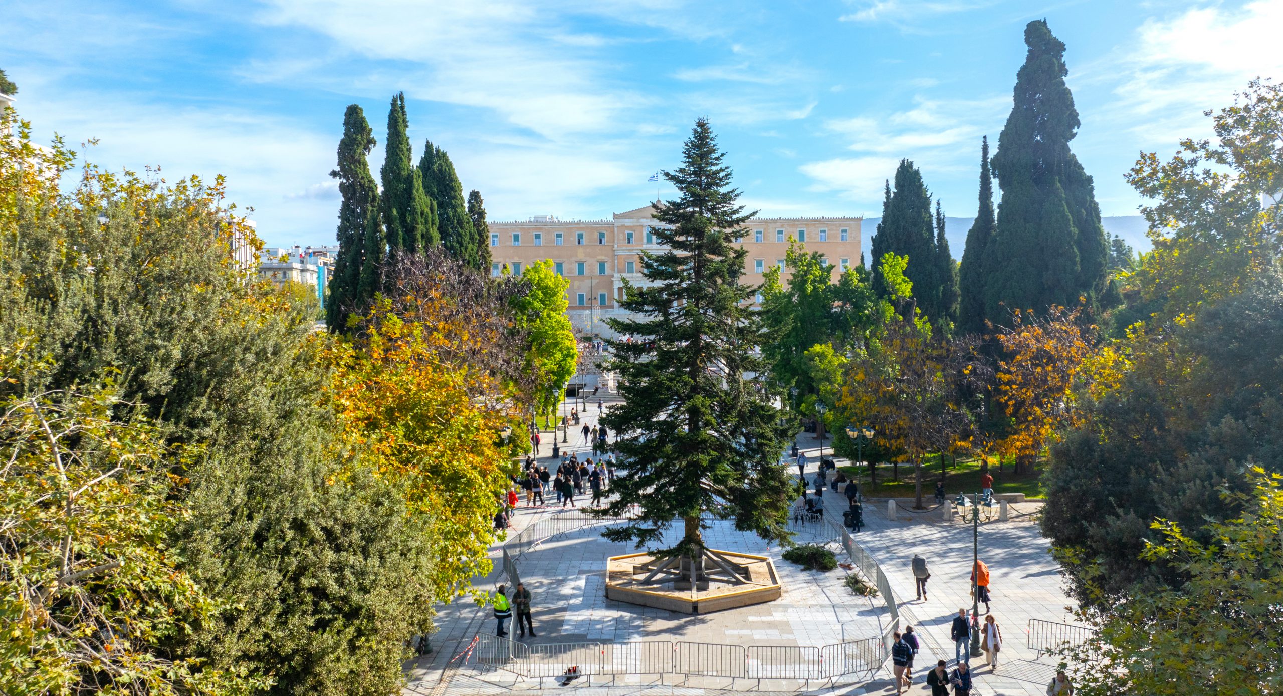 This year’s 20-meter Christmas tree from a nursery in Halkidiki, will go to the Athens School of Fine Arts after the holidays so it can be used as raw material for artistic wood carving projects for its students.