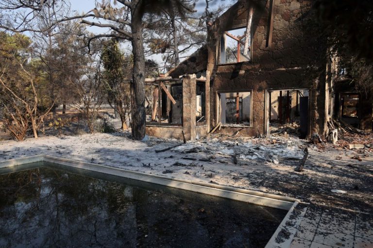A burnt house is seen, as a wildfire burns in the village of Souni near Limassol, Cyprus July 24, 2025. REUTERS/Yiannis Kourtoglou