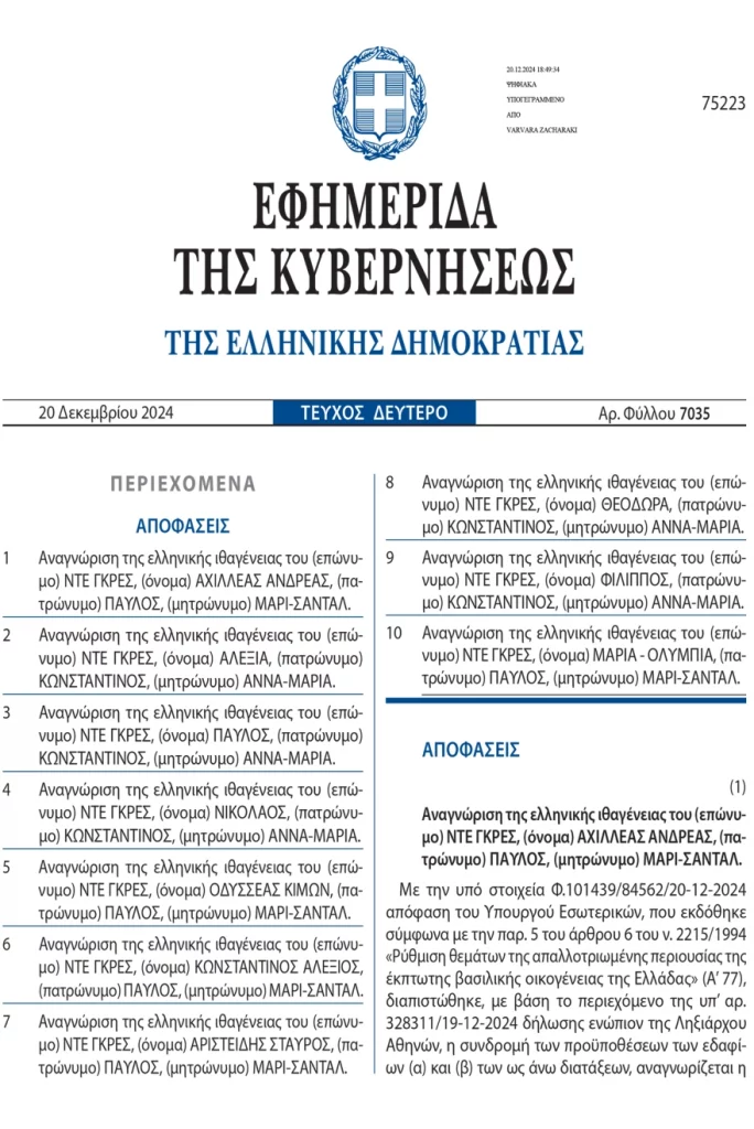 Decisions granting Greek citizenship to the five adult children of former monarch Constantine, who passed away in 2023, was officially published in the Government Gazette on Friday.