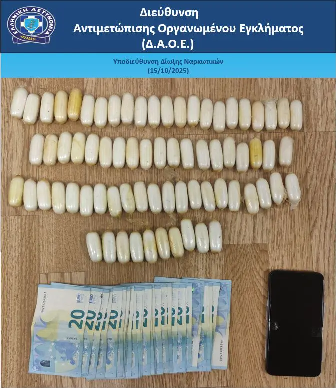 According to the Hellenic Police, the man arrived in Athens on a flight from France and was apprehended during a targeted inspection by officers from the Anti-Narcotics Division of the Hellenic Police’s Organized Crime Directorate. Acting on intelligence and using profiling techniques to identify potential traffickers, officers located and detained the suspect upon his arrival from abroad. Investigators believe he was acting as a “mule” for an international drug trafficking network operating between Latin America and Europe.