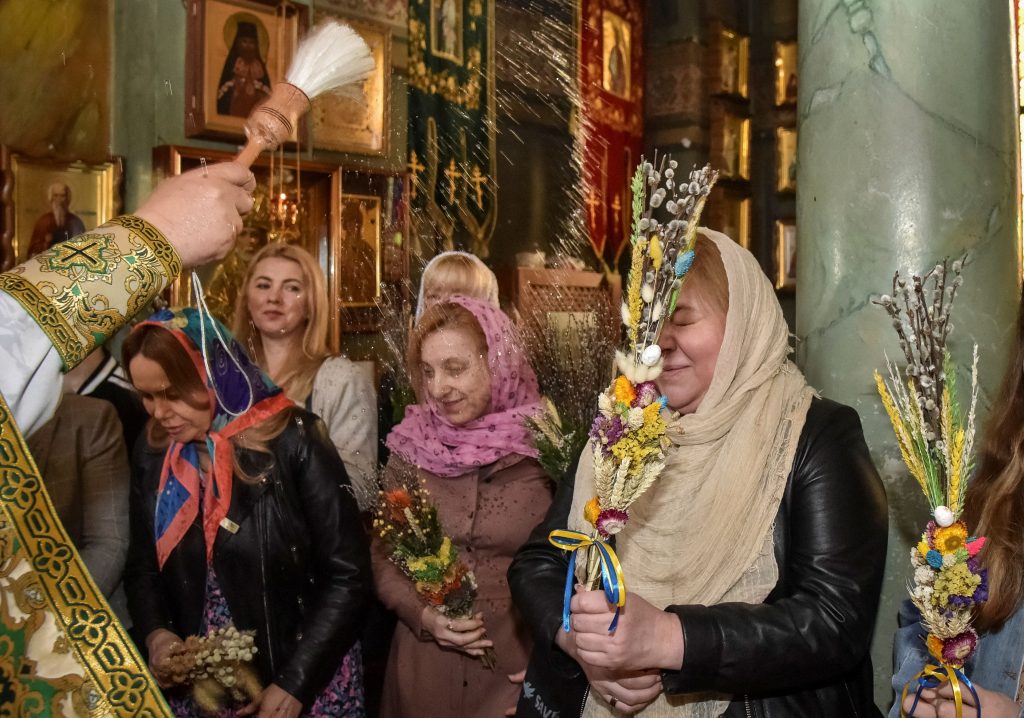 A priest sprays holy water on believers after a service which marks the Orthodox feast of Palm Sunday in a church, amid Russia’s invasion of Ukraine, in Lviv, Ukraine April 28, 2024. REUTERS/Pavlo Palamarchuk