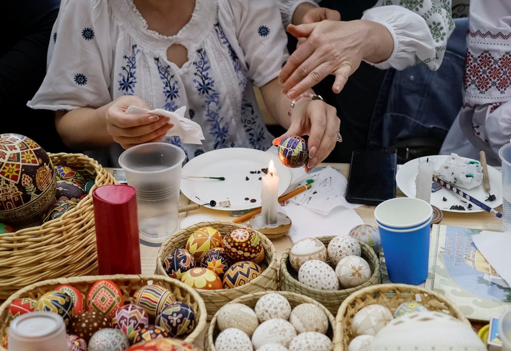 Women practice decorating a pysanka, a Ukrainian Easter egg, as they attend a lesson in traditional style painting, as part of the upcoming celebrations of Easter, amid Russia’s attack on Ukraine, in Kyiv, Ukraine, April 30, 2024. REUTERS/Alina Smutko