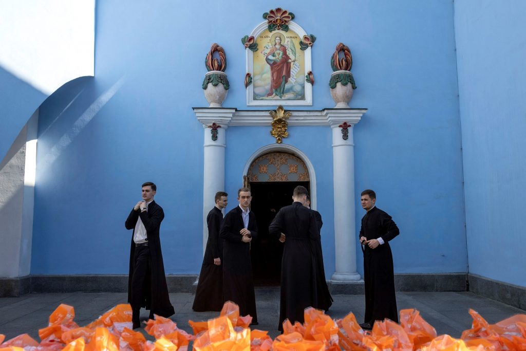 Orthodox clergymen attend a service blessing Easter cakes that will be sent to Ukrainian servicemen at the front for Orthodox Easter, amid Russia’s attack on Ukraine, during a ceremony at St Michael’s Cathedral in Kyiv, Ukraine, May 2, 2024. REUTERS/Thomas Peter