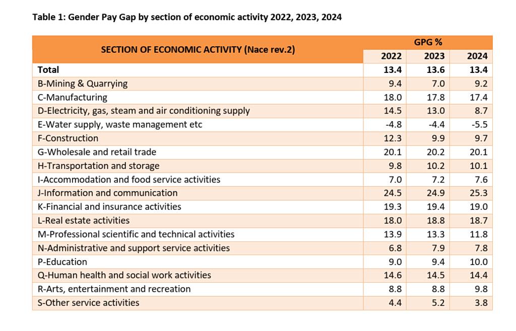 The largest gap was recorded in the Information and Communication sector, which includes media and telecommunications and according to the data, it keeps widening. In that field, women’s hourly earnings were lower than men’s by 24.5% in 2022, 24.9% in 2023 and 25.3% in 2024.