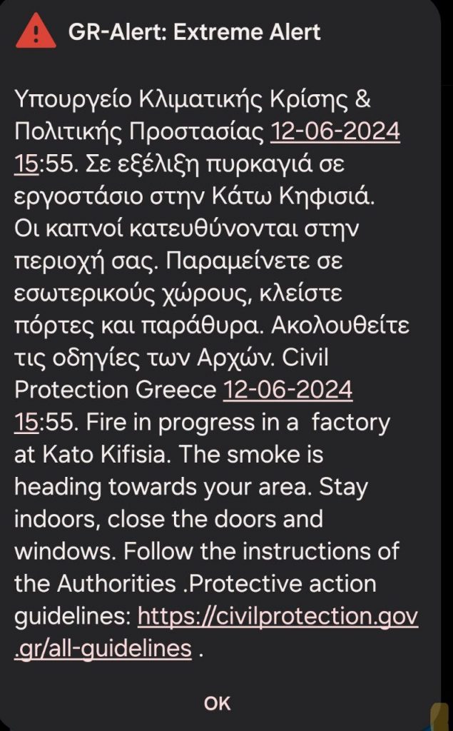 Greece’s Citizen Protection Ministry sent warning text messages via the 112 emergency number, advising residents to stay indoors and shut all doors and windows.