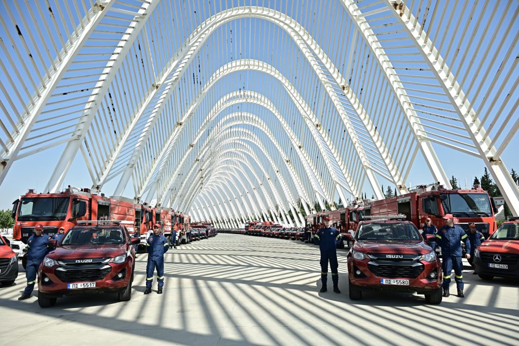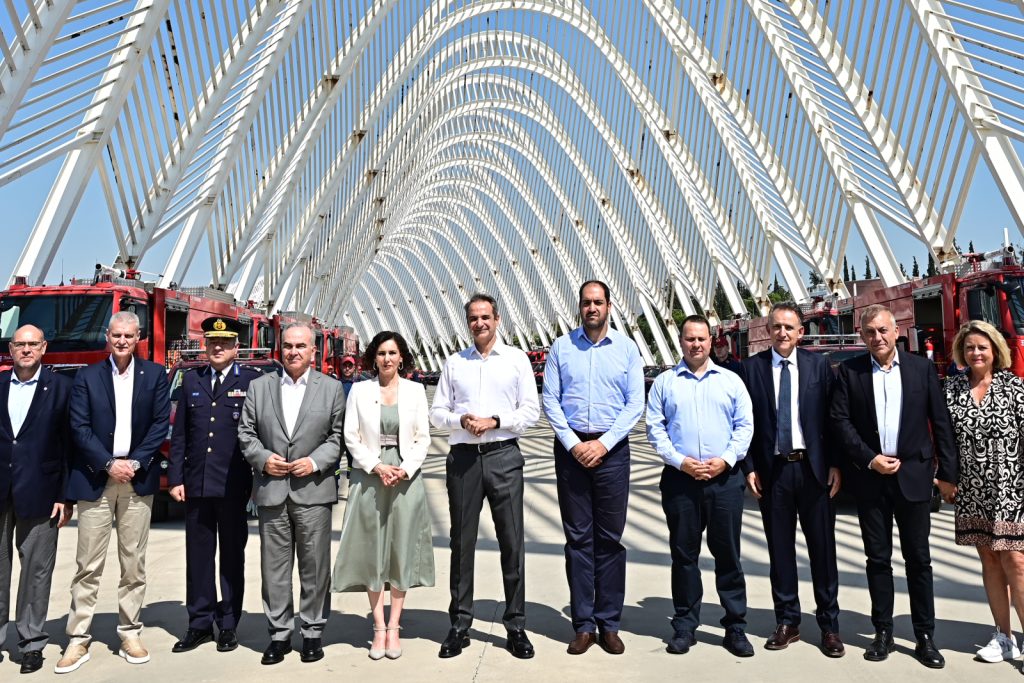 In a major step to strengthen Greece’s civil protection capabilities during one of the most challenging wildfire seasons in recent years, Prime Minister Kyriakos Mitsotakis announced the addition of 164 new vehicles to the Hellenic Fire Service. The vehicles were presented during an official ceremony held at the Athens Olympic Sports Complex (OAKA) on Friday, July 18, attended by EU Commissioner for Equality, Preparedness and Crisis Management Hadja Lahbib.
