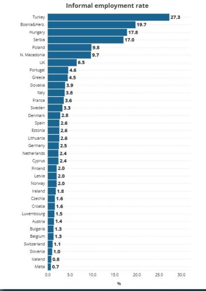 Hungary and Poland had the highest rates of informal employment among EU countries, with 17.8% and 9.8%, respectively. In contrast, the informal economy is much less prevalent in other member states falling below 2% in one-third of the EU countries.