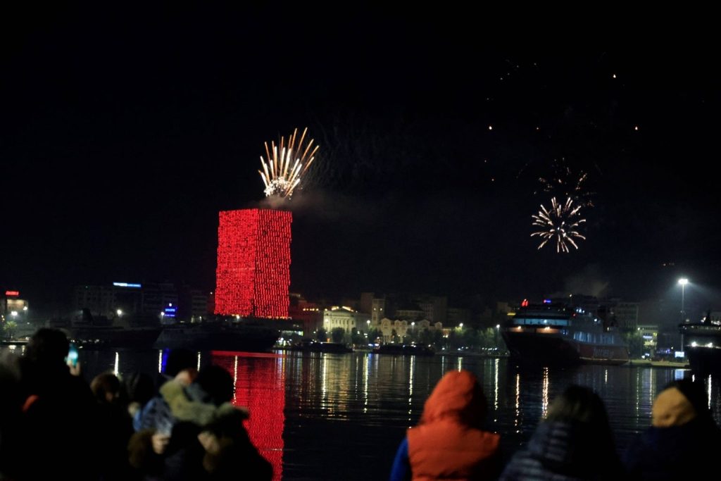 The same imagery, with fireworks, laser shows and musical performances, was held in Thessaloniki’s main Aristotelous Square.