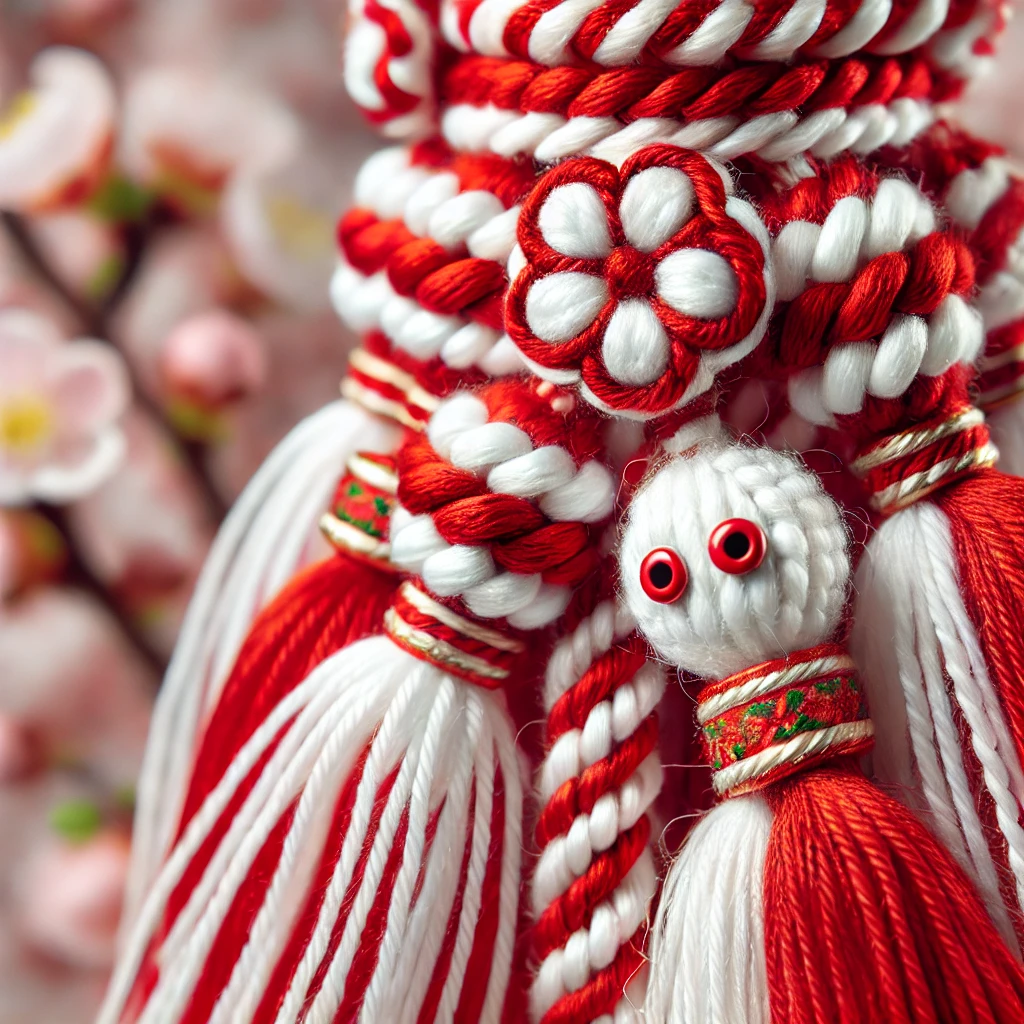 A traditional Bulgarian Martenitsa, featuring red and white twisted yarn and symbolic tassels.
