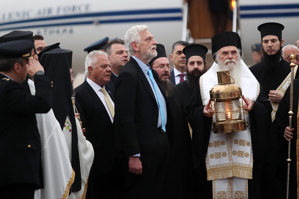 Parliament Speaker Nikitas Kaklamanis attended the reception ceremony at the Athens airport, while a military guard of honor paid tribute. Among those present were the Markopoulo Philharmonic Band, which performed the national anthem, the Greek Scouts, the Pontian Association of Lavrio carrying an icon of the Resurrection, and the Asia Minor Association of Rafina, among others.