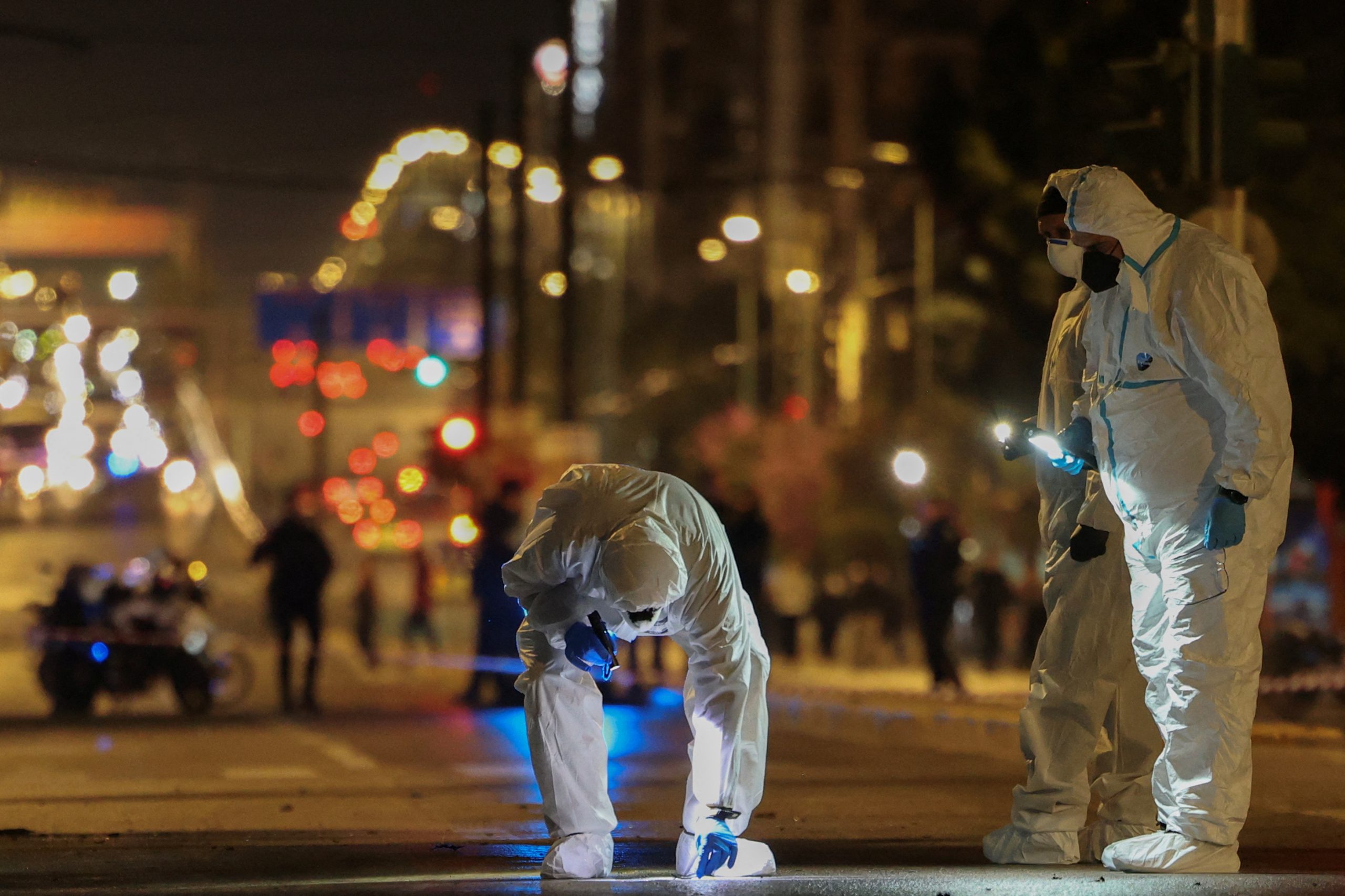 Forensics officers investigate the area of a bomb blast outside the Hellenic Train offices, in Athens, Greece, April 11, 2025. REUTERS/Stelios Misinas
