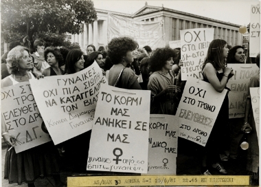 Women gathered at the entrance of the university. They hold banners with slogans about “vile” teasing on the streets, rape and terrorism. Florou Bros, Collections of the OTE Group Telecommunications Museum. CC BY-SA 4.0