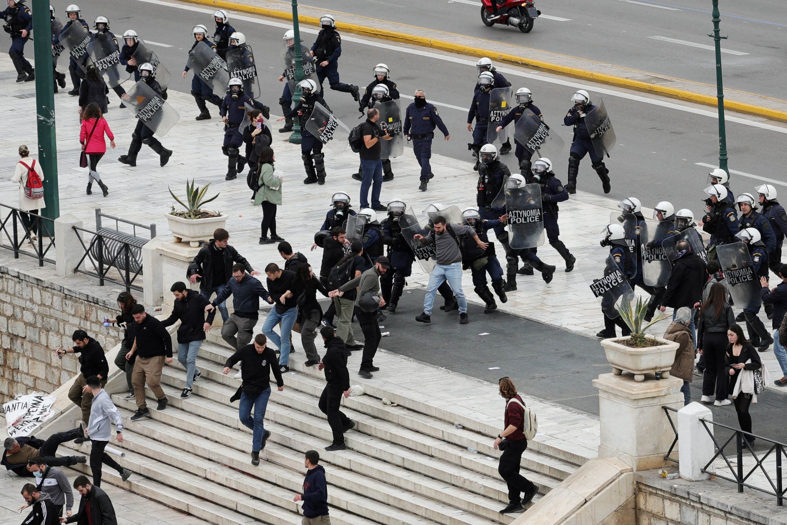 Skirmishes broke out between police and a small group of about 20 masked individuals during a protest outside the Greek parliament on Wednesday afternoon, after the latter separated from the main body of a crowd taking part in protest march on the occasion of a nationwide strike. The masked individuals hurled firebombs at the outer courtyard of the Parliament building.