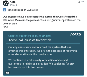 Shortly after, NATS—the UK’s air traffic control provider—confirmed via X (formerly Twitter) that the issue had been resolved.