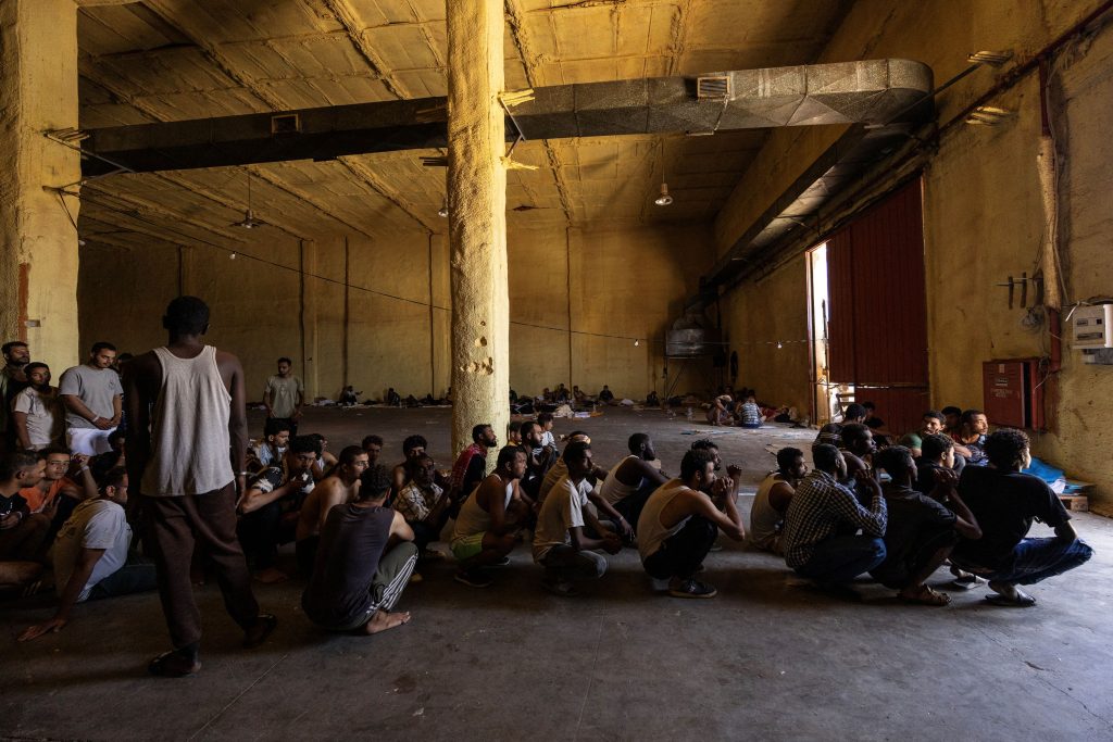 Migrants, who recently arrived in Crete, sit at their temporary shelter staged in a former facilities of citrus producers at the town of Rethymno, on the island of Crete, July 12, 2025. REUTERS/Nicolas Economou