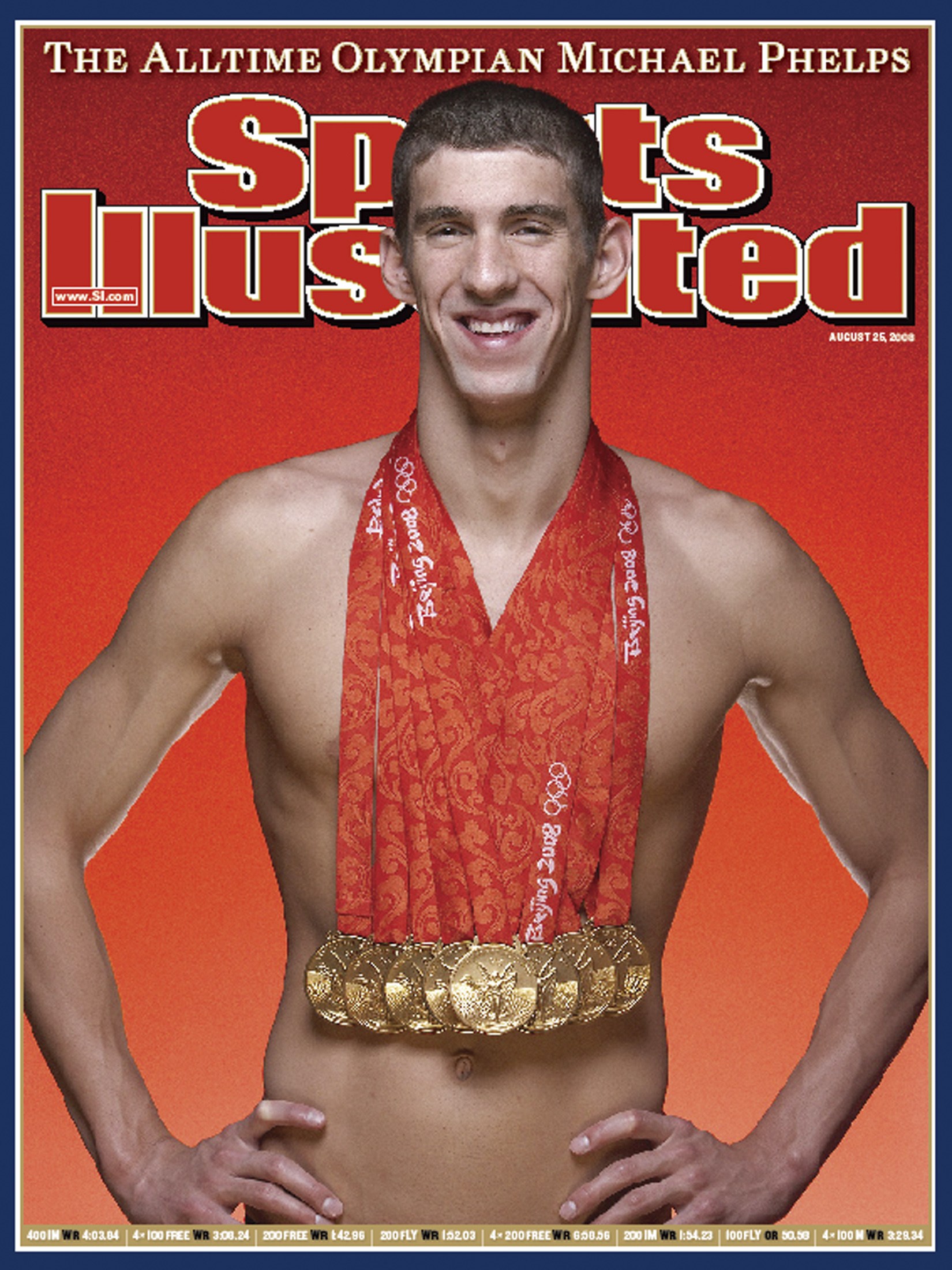 U.S. swimmer and all-time Olympian Michael Phelps poses exclusively for the August 25, 2008 edition of Sports Illustrated in this photograph taken in Beijing, China on August, 17, 2008. Phelps, 23, posing with his eight medal collection, the richest gold medal haul ever from a single Olympic Games, marks Phelps fifth appearance on the cover of Sports Illustrated. Phelps has more SI covers than any other swimmer including Mark Spitz, who is second with three. The August 25, 2008 issue of Sports Illustrated will go on sale on Wednesday. Photo taken August 17, 2008. REUTERS/Simon Bruty/Sports Illustrated (SI.com)/Handout