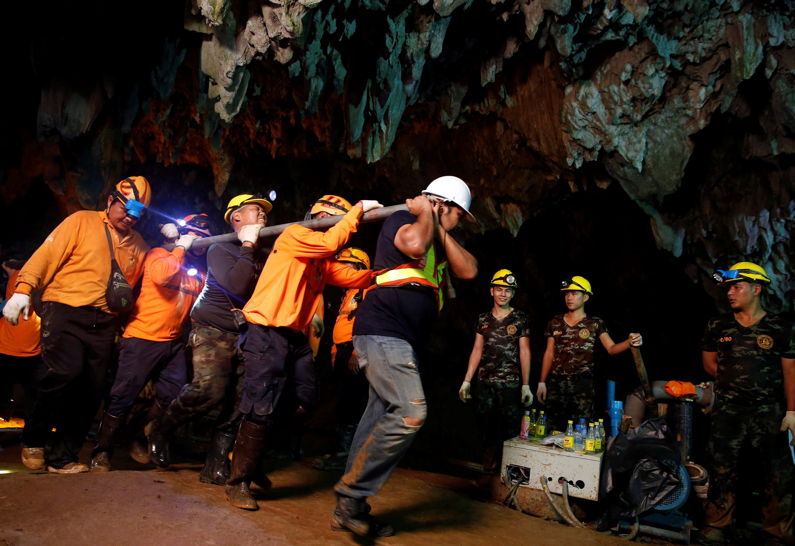 Rescue workers take out machines after 12 soccer players and their coach were rescued in Tham Luang cave complex in the northern province of Chiang Rai, Thailand, July 10, 2018. REUTERS/Soe Zeya Tun