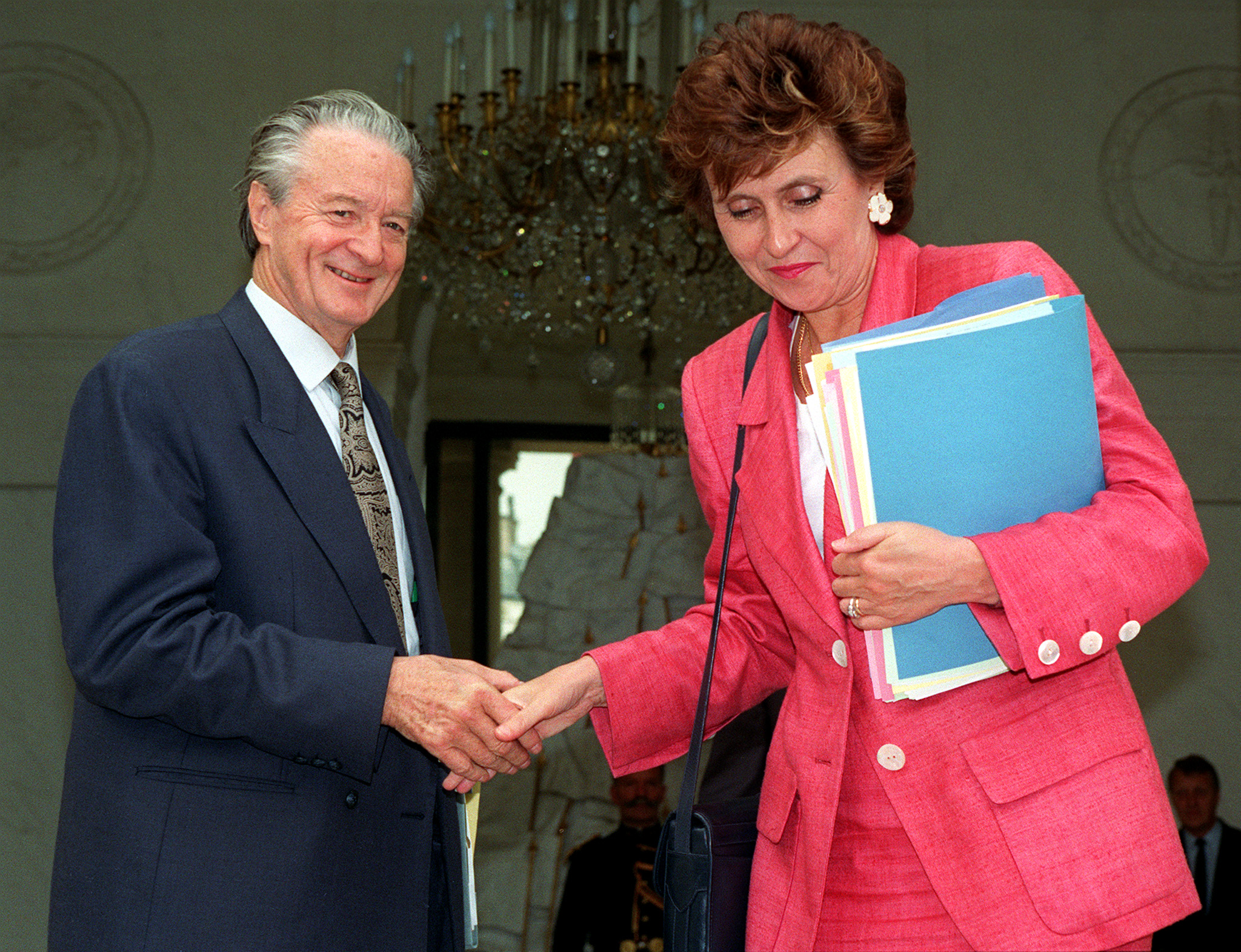PRI96 – 19910703 – PARIS, PARIS, FRANCE : (files) File photo dated 03 February 1991 at the Elysee Palace shows former French Prime Minister Edith Cresson (R) with former Foregn Affairs Minister Roland Dumas, charged with corruption. The French daily Le Monde alleged 23 February 2000 that a company set up by Cresson received 3 million francs from a Swiss subsidiary of the oil giant Elf in connetion with the buy-out by Elf of the then-East German petrol refinery Leuna.