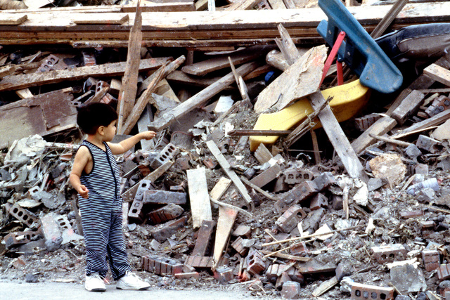 Following a tornado, three-year-old Adam Fields is left wondering why his plastic slide is in the pile of rubble that used to be his house. Said to be Oklahoma’s worst tornado in 17 years, it was categorized by meteorologists as F-5 using the Fujita-Pearson scale and destroyed nearly 2,000 homes and damaged 7,000 others. This photograph was used in the article “Real-life Twister,” from the September 1999 Airman Magazine. Combined Military Service Digital Photographic Files