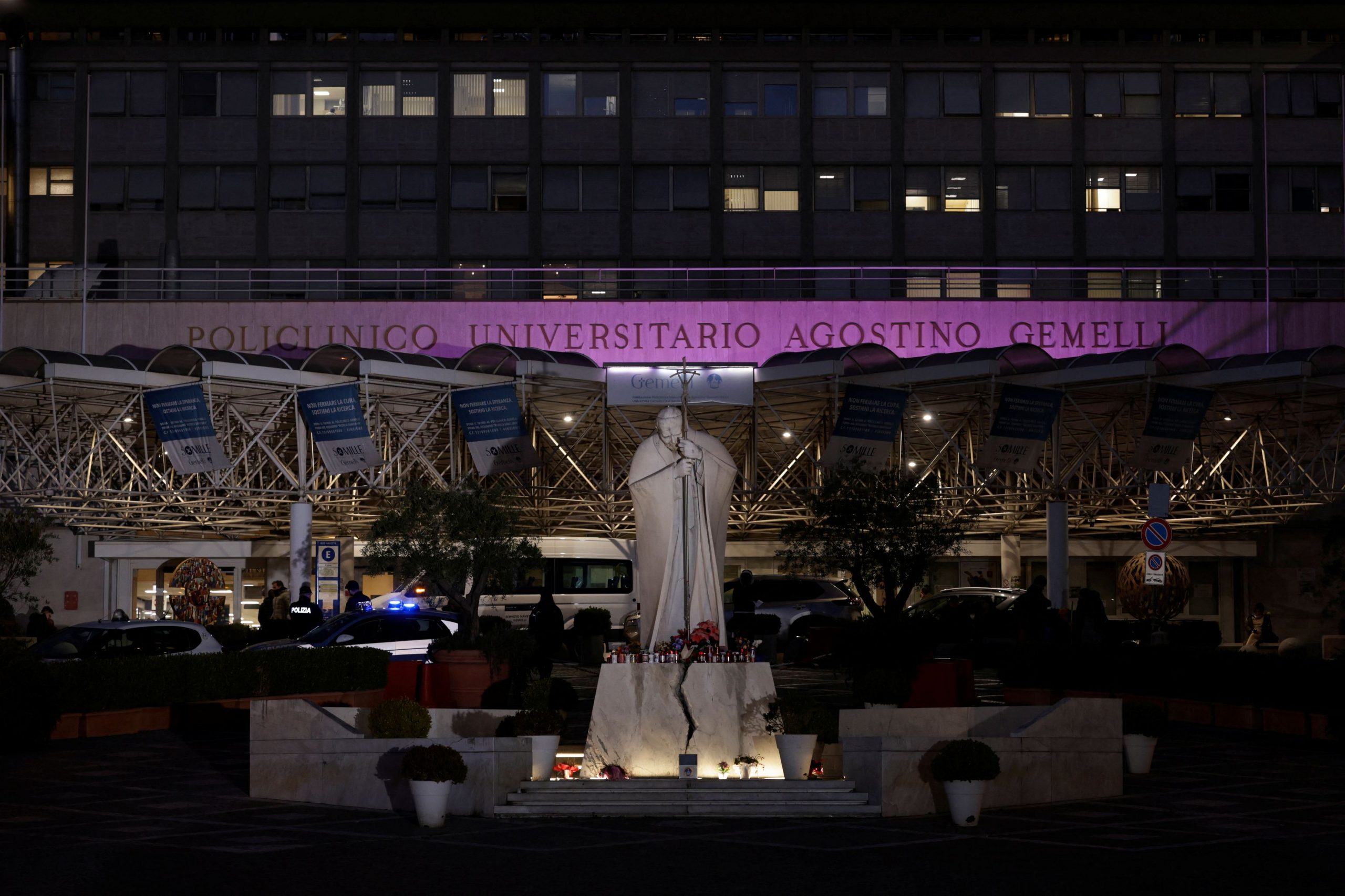 The statue of the late Pope John Paul II stands outside the Gemelli Hospital, where Pope Francis is admitted to continue treatment for a respiratory tract infection, in Rome, Italy, February 18, 2025. REUTERS/Remo Casilli