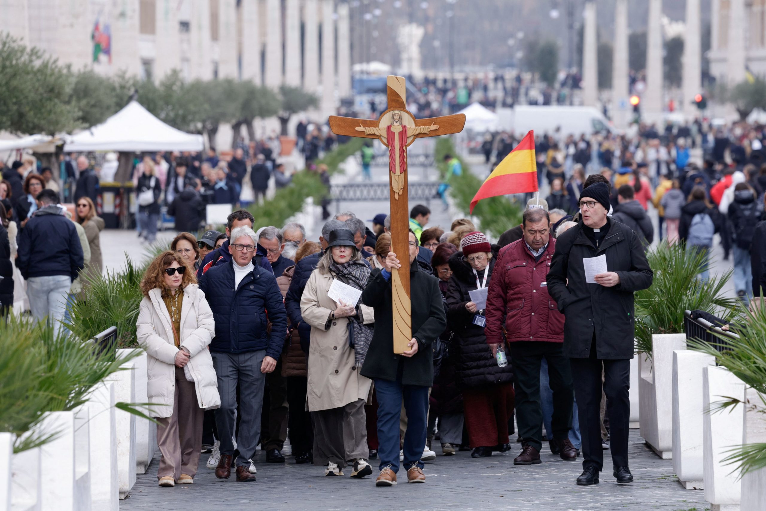 A pilgrim carries a cross on the day of the weekly general audience, which has been cancelled as Pope Francis is admitted to Gemelli Hospital to continue treatment for his ongoing respiratory tract infection, at the Vatican, February 19, 2025. REUTERS/Remo Casilli