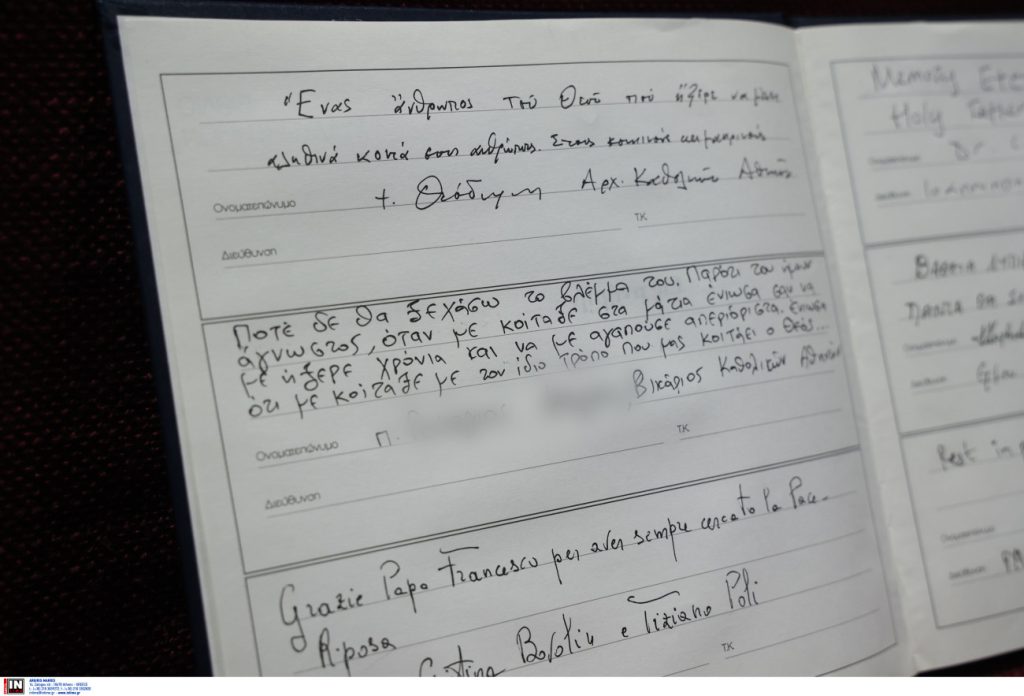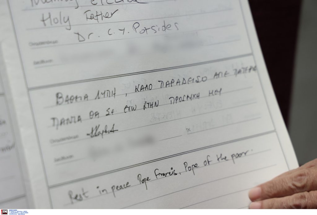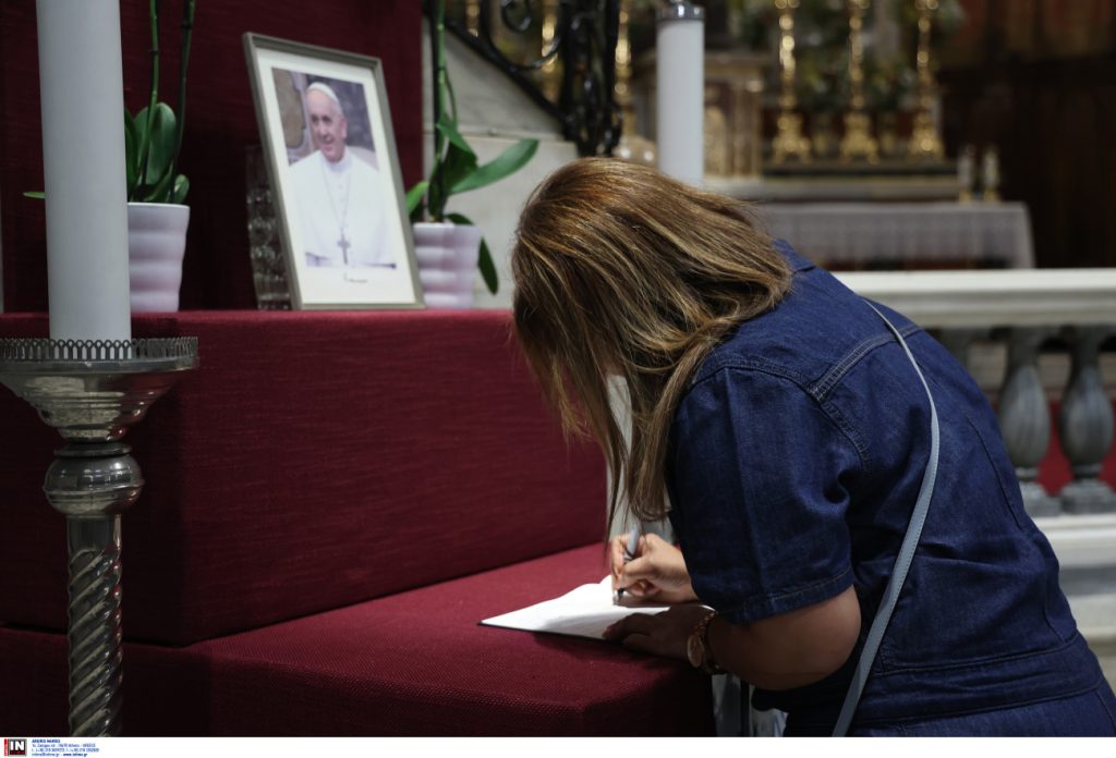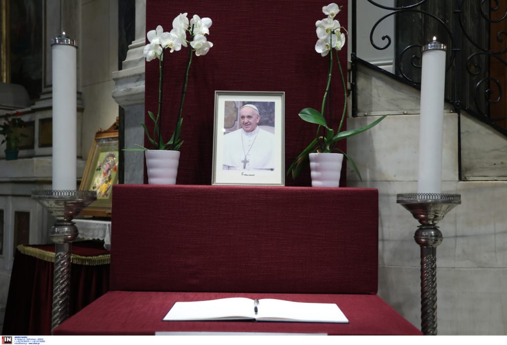 In Athens, a condolence book has been placed at the Cathedral of Saint Dionysius the Areopagite since Tuesday morning, accompanied by a portrait of Pope Francis.
