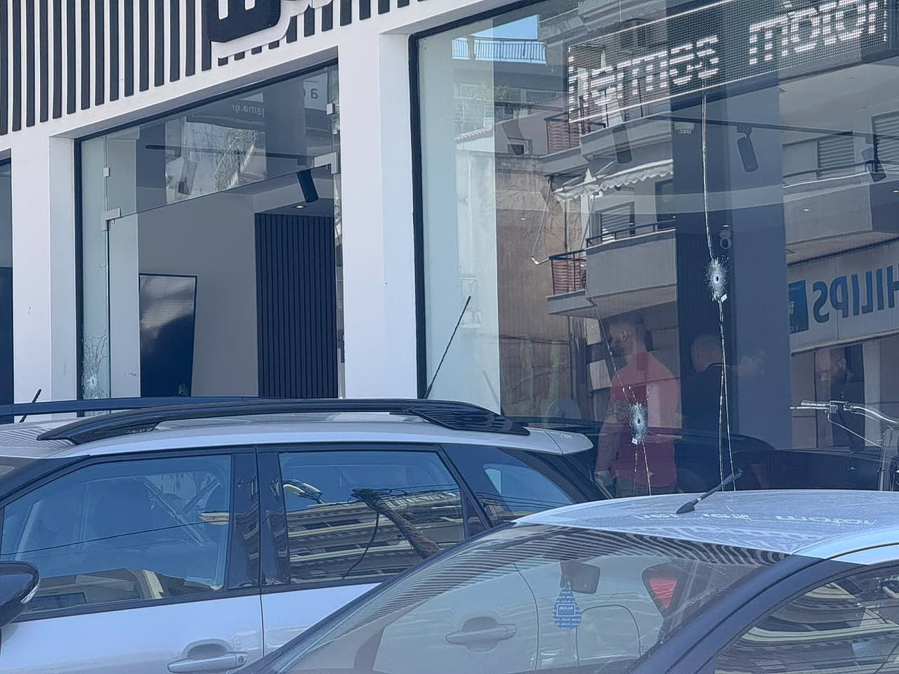 The incident took place on a central avenue, where the attackers reportedly shot at the storefront before fleeing the scene. Several vehicles, the shop’s glass frontage, and interior areas were damaged.