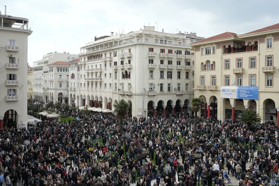 A view of the rally at Aristotelous Square, in the northern city of Thessaloniki on Saturday, Feb. 28, 2026.