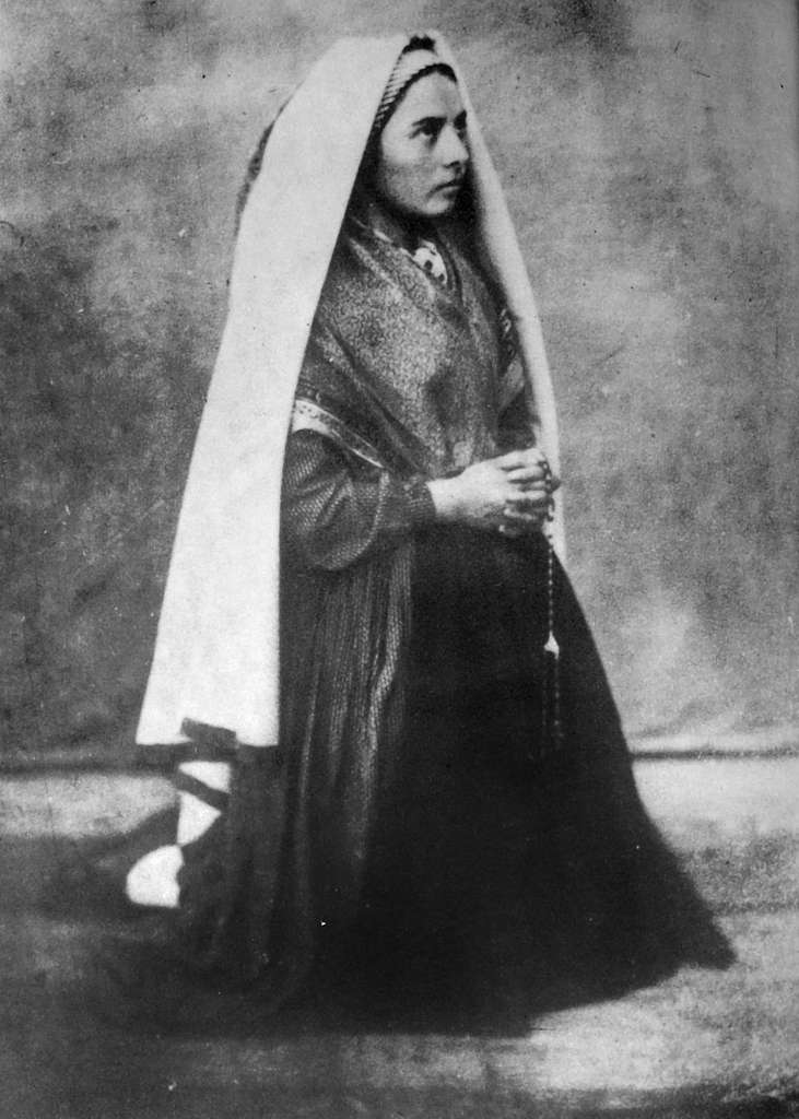 Born in Lourdes, France, Bernadette spent her entire life in weak health. She began seeing visions of the Virgin Mary at age 14 and facing opposition from her family and local priest, she spent the rest of her life in prayer secluded from the outside world until her death in 1879. Her visions were authenticated by Pope Pius IX in 1862, initiating the cult of Our Lady of Lourdes.