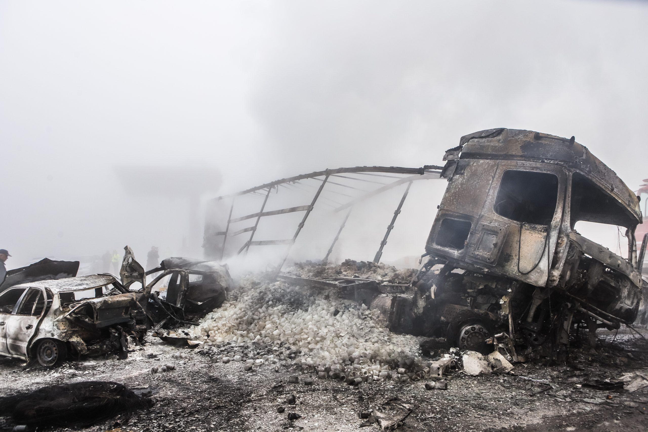 The collision triggered a fire in the middle vehicle, trapping its two occupants. Firefighters responded quickly but were only able to retrieve their charred bodies. The drivers of the first car and the truck managed to escape before the fire spread to their vehicles.