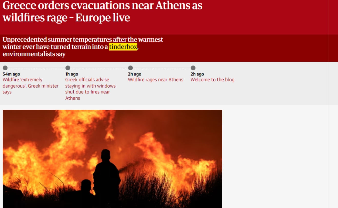 Popular online outlets such as the BBC, CNN, Reuters, the Guardian, and Liberation, are covering the evacuations of citizens surrounded by flames by Greek authorities.