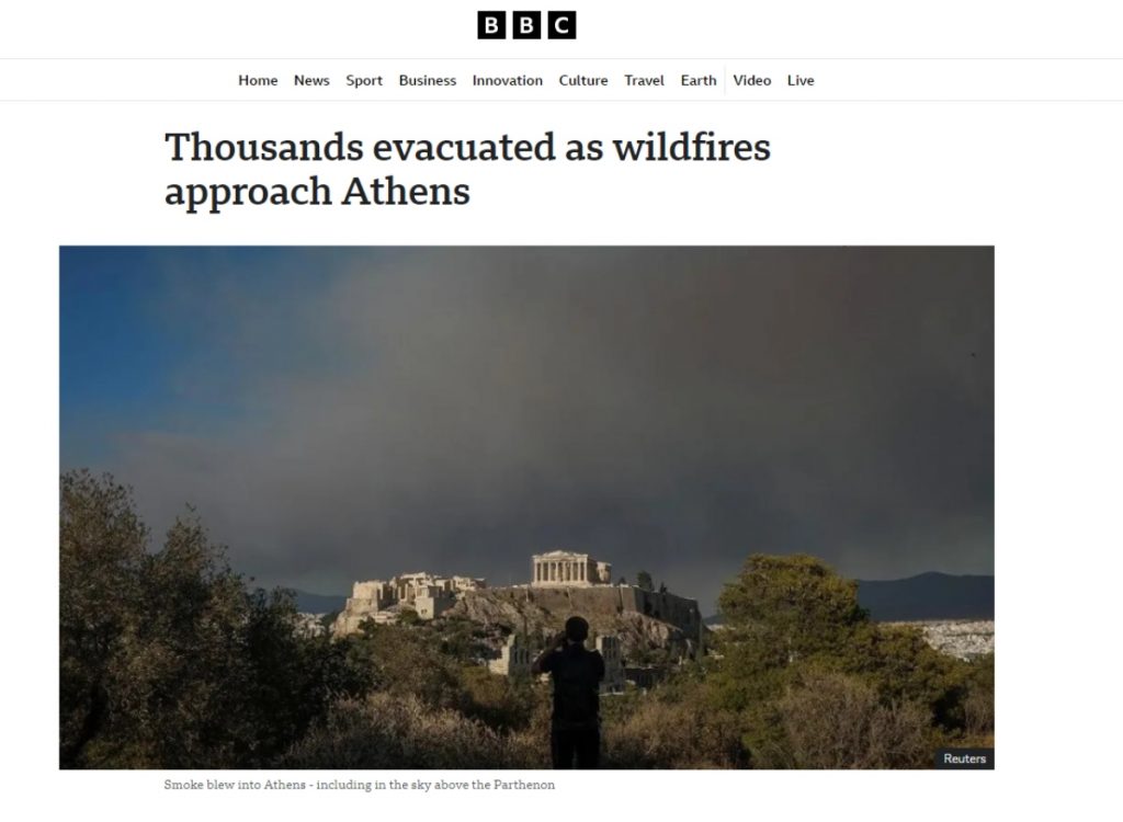 As the large wildfire in Athens continues to rage across areas on the outskirts of the Greek capital proper with evacuations ordered and vast expanses of forest land burnt, including residences, the international media are covering the situation extensively with headline reports.