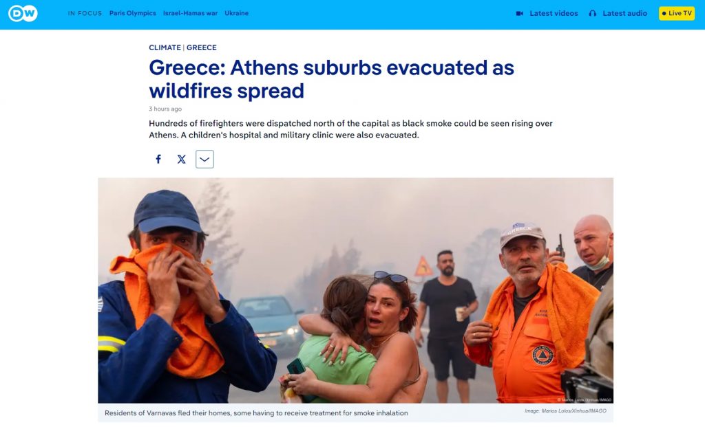 French newspaper Figaro reports that since Sunday, a race against time has been underway in the suburbs of Athens as a massive fire broke out,” while German outlet Deutsche Welle noted in its headline: “Athens’s suburbs evacuated due to forest fires.”