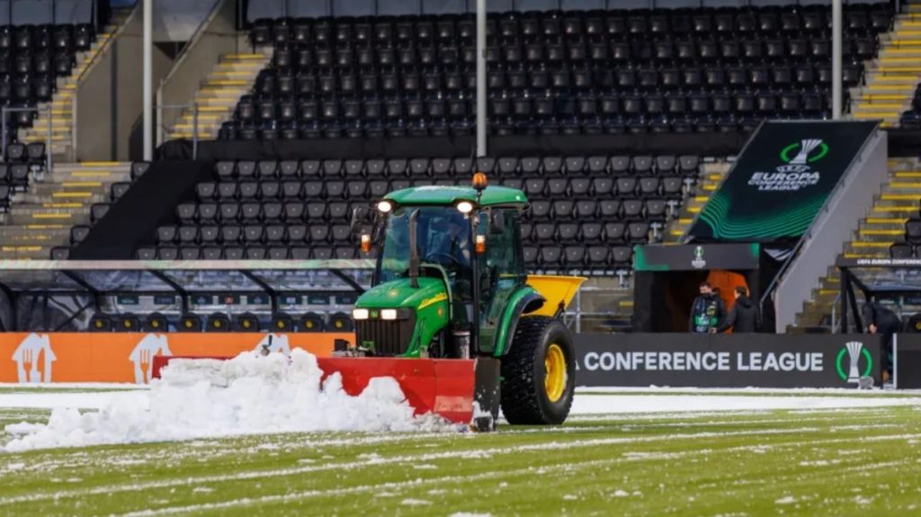 Snow and ice, far from an ideal combination for the plastic surface at Bodo/Glimt’s home field.