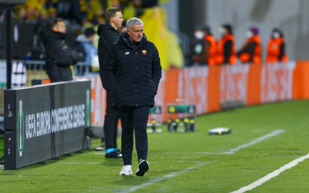 Roma coach José Mourinho pacing the sidelines during his team’s away match against Bodø/Glimt, with the turf’s creases prominently on display.