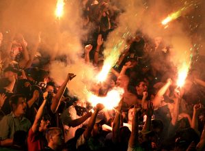 According to police, hooligans came out of the indoor sports arena firing missiles, firebombs and flares directly at police officers, resulting in serious injury to one officer.